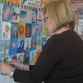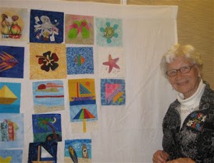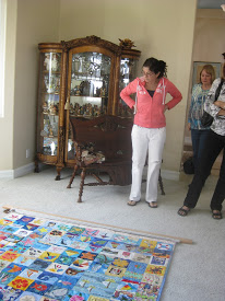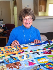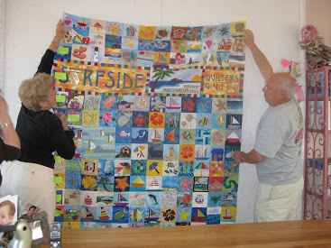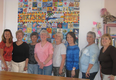 Finished front 59" x 69". The traditional quilt for the outgoing President of Surfside Quilters Guild. Theme: Beach. Color: Bright. Joyce Conyers, Mary McKinney, Jean Bull, Irmgard Terbrack, Glenda Razor and Judy de Gruy. Jean Bull (center in red) is assisting by collecting and ha Cecile Rogers hangs her colorful pieced fish block. 2/15/11 Nancy Bloyer and January (guide dog in training) open their home for the trimming session. Trimming blocks to 5 1/2 x 5 1/2 are Mary Freedman, Carol Whiteside, Maggie Bell, Joann Bishop, Barbara Seidel. This is fun! Mary Freedman and Carol Whiteside. Maggie Bell and Joann Bishop. Barbara Seidel, Nancy Ota, Mary Freedman, Carol Whiteside. Nancy Ota prepares to paint the back. Back is drying. Diane Collins created umbrellas for signatures for the backart. Marcia Faultersack and Lyndy Dye collected blocks in March. Maggie Bell and Hiroko Moriwaki trimmed blocks at Nancy Ota's, March 8. Janis Schonfeld and Sheri Hill also trimmed blocks. March 9 at Mary Freedman's studio, Judy Dunlap is placing blocks on the design wall. Marjie Butterworth, Mary Freedman and Maggie Bell making placement decisions. Joann Bishop and Odette Osantowski are placing blocks. We are thinking this looks pretty good. Designated row numbers. Barbara McFarland, Janis Schonfeld, Maggie Bell and Marjie Butterworth pinning each row. Janis Schonfeld pinning. Marjie Butterworth pinning and Barbara McFarland helping a sewer. Mary Freedman, Joann Bishop and Odette Osantowski. Nancy Ota and Hiroko Moriwaki. Busy sewers, Nancy Ota, Hiroko Moriwaki and Janis Schonfeld. Judy Dunlap getting ready to press the row. Barbara McFarland, Hiroko Moriwaki, Janis Schonfeld and Maggie Bell signing the backart. Okay, time to break for lunch, Marjie Butterworth. Nice lunch break on Mary Freedman's patio, some wanted shade. Lunch. Some wanted sun. Lunch. Beautiful day at Mary's. We all wanted dessert by Mary. Dessert. Dessert. Yummy! Judy Dunlap and Mary Freedman. Back to stitching, Joann Bishop. Odette Osantowski is sewing the rows together. Hiroko Moriwaki. Maggie Bell and Mary Freedman, thrilled at the progress. Judy Dunlap more pressing. Thanks to Mary and David Freedman for allowing us to use their beautiful home. We began at 10 am and by 2 pm the top was sewn. Joann Bishop and David Freedman placed it back on the design wall for us to admire. David, Odette and Marjie. 2 pm Mary, Maggie, Marjie, Judy, Hiroko, Nancy, Joann and Odette marvel at quilt by our talented members. Yay! The painted backside and possible placement of the signature umbrellas. Back at Mary Freedman's to baste the quilt. Nancy Bloyer, Mary Freedman and Becky Reed. Mary Freedman threading basting needles and putting them into her giant pin cushion. Nancy Bloyer and Mary Freedman. Basting by hand, Barbara Ann Christensen, Becky Reed, Sharon Dowlan and Nancy Bloyer. Becky Reed, Mary Freedman, Nancy Ota, Barbara Ann Christensen, Sharon Dowlan, Nancy Bloyer. Nancy Bloyer, Becky Reed, Barbara Ann Christensen, Sharon Dowlan and Mary Freedman. Becky Reed attaching the quilt to the frame bar. Rolling the rail, Becky Reed and Nancy Ota. Set and stand Nancy Bloyer has the quilt, all rolled up and on the rails. The first quilt bee was hostessed by Nancy Bloyer. The first guest was Kathie Bellamy. Quilt Bee Hostess Barbara Trulis. Bee Hostess Nafsi Martin in her garden. Another bee hostessed by Nafsi Martin. Attending are Linda Walters, Sumi Maruyama and Judy. Judy deGruy, Joyce Conyers, Glenda Razor, Ardie Chamness, Sumi Maruyama and Linda Walters. Jeanne Tavasci, Phyllis Parente, Jan Hirth, Sharon Dowlan. Chris Huben, Mary Freedman, Mariann Thurman, Kathy Stewart. Bee Hostess Connie Veldkamp. Sheryl Smith-Bailey, Priscilla Hackbarth, Jane Salem. Quilt Bee Hostess, Sheri Hill. Quilting Bee hostess Maggie Bell. Wendy McCalley came to add her stitches. Sheri Hill Bee, Vicki Janis, Joann Bishop, Judy Lawry and Lyn McQuerry. Sheri Hill's Bee, Joann Bishop, Judy Lawry, Lyn McQuerry. Carol Whiteside, Quilting Bee Hostess. Carol Whiteside's Bee, Claudia Evans and Marjie Butterworth. Carol Whiteside's Bee, Claudia Evans and Hiroko Moriwaki. Carol Whiteside's Bee, Joann Bishop and Nancy Bloyer. Mary Freedman helps appliqué the backart. Finished back Close up of Board Members signature umbrella. President Sharon Whelan and husband Dan. Past President Nancy Ota (quilt coordinator) introduces the creators of the quilt. L-R Sue Richardson, Marcia Faultersack, Nancy Ota and Jan Hirth. Outgoing President Sharon Whelan (seated), husband Dan, Mary Freedman, Lyndy Dye, Nancy Bloyer, Maggie Bell. Maggie bell, Barbara McFarland, Judy Dunlap, Barbara Seidel, Sue Richardson. Maggie Bell, Barbara McFarland, Judy Dunlap, Barbara Seidel, Marjie Butterworth, Sue Richardson. Sharon Whelan, Dan Whelan, Lyndy Dye, Jane Salem, Mary Freedman, Marjie Butterworth, Nancy Bloyer, Hiroko Moriwaki, Maggie Bell, Janis Schonfeld, Barbara McFarland, Judy Dunlap, Carol Whiteside, Barbara Seidel, Joann Bishop. Sue Richardson, Marcia Faultersack, Nancy Ota. Back row: Barbara Ann Christensen, Jane Salem, Marjie Butterworth, Hiroko Moriwaki, Janis Schonfeld, Barbara McFarland, Judy Dunlap, Barbara Seidel, Sue Richardson. Front: Sharon Whelan, Dan Whelan, Connie Veldkamp, Mimi Harris, Sheri Hill, Sharon Dowlan, Carol Whiteside, Nafsi Martin, Joann Bishop, Marcia Faultersack, Becky Reed, Barbara Trulis. Back to top Newsletters Speakers and Workshops Philanthropy Membership, Map and Forms Sponsors Block of the Month Patterns Quilting Resources Activity Photos Presidents Quilt Bylaws Board Meeting Minutes General Meeting Minutes Privacy Statement Terms Of Use Site Map