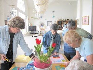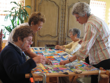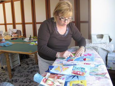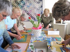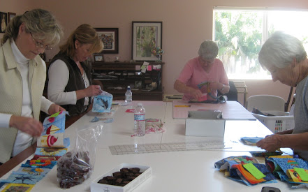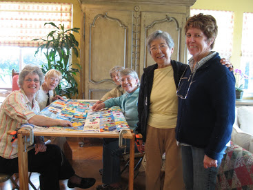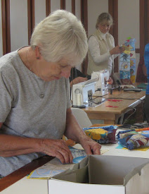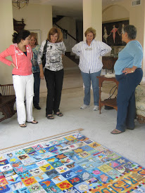 Trimming blocks to 5 1/2 x 5 1/2 are Mary Freedman, Carol Whiteside, Maggie Bell, Joann Bishop, Barbara Seidel.