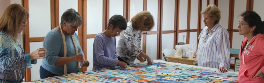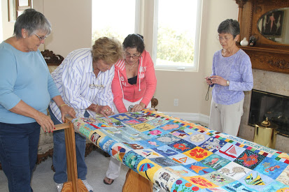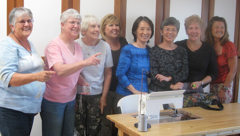 Mary, Maggie, Marjie, Judy, Hiroko, Nancy, Joann and Odette marvel at quilt by our talented members.