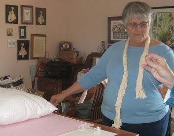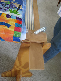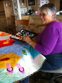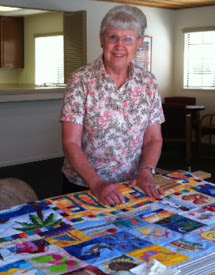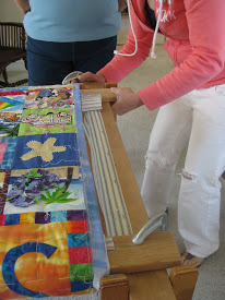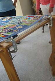Nancy Bloyer has the quilt, all rolled up and on the rails.