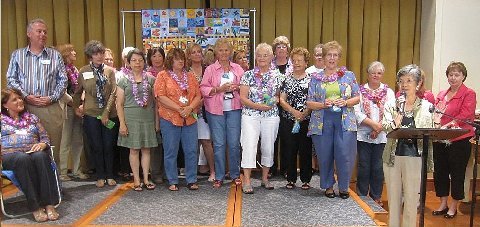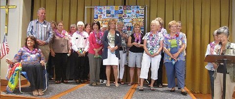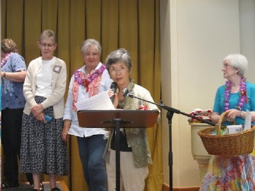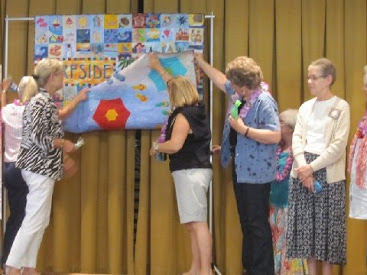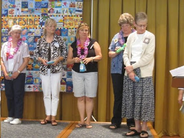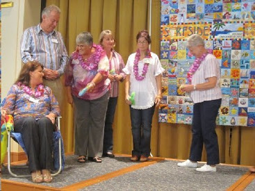 Past President Nancy Ota (quilt coordinator) introduces the creators of the quilt. L-R Sue Richardson, Marcia Faultersack, Nancy Ota and Jan Hirth.
