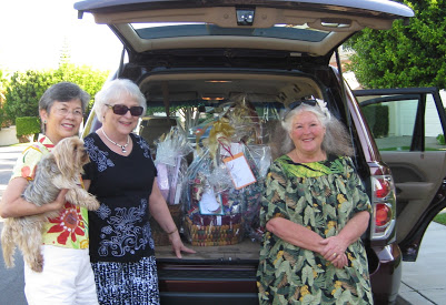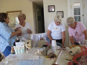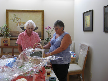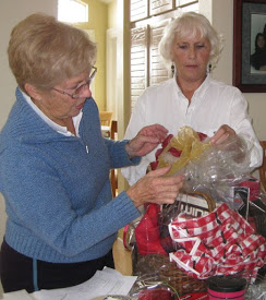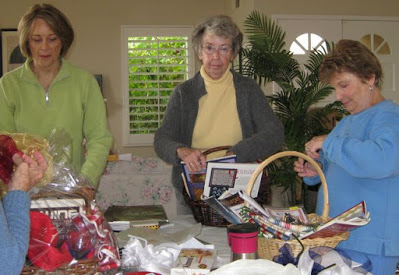 Maggie Bell donated another picnic basket. This one with wine glasses and even a possible table cloth. Joann Bishop and Mary Jayne Bellamy are writing the list of contents and wrapping.