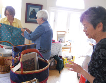 Jane Salem, Joann Bishop, Marjie Butterworth, Maggie Bell Sorting, selecting, listing, and wrapping. Mary Jayne Bellamy, Mary Freedman. Opportunity Baskets waiting to be identified. Mary Freedman preparing bows while Joann takes over wrapping the basket. Mary Freedman and one of her many masterpieces! Marjie Butterworth worked hard, but only wanted the top of her head to show in the picture. Sharon Pembrook curling a ribbon on a finished basked (notice the light blue framed paper - it has the inventory of what is in the basket) Nancy Ota with a finished basket ready for the "hallway" to await being picked up on 11-8-10. "Pink" basket containing, among other items, the pink quilt book and pink cook book donated by Rosie's Calico Cupboard. Also visible, one of the 8" t Kathie Bellamy checking out the baskets after the first day of wrapping. We did have two more mornings of fun at the Wrap House. Mary Jayne Bellamy finds it difficult to decide how much we can stuff each basket. Mary Freedman and Maggie Bell think the members will have a really fun time November 9. Sharon Pembrook and Joann Bishop. We actually had many more hands involved, but we were too busy to take pictures. So far two wrap sessions and man. Sharon Pembrook and Marjie Butterworth wrapping. Nancy Ota with donations from Nana's. Joann Bishop with a donation from Capistrano Sew and Vac. Sumi Maruyama is tying the content labels created by Nancy Bloyer. Easy to see what is inside and who helped fill it. Julie Maben, Julie Vlahos and Mary Jayne Bellamy trying to decide how to fill this basket. Sharon Pembrook said her husband could not believe how many baskets we were filling. Kathie Bellamy just delivered more books from sponsors and Julie Vlahos is having fun filling the basket. Maggie Bell donated another picnic basket. This one with wine glasses and even a possible table cloth. Joann Bishop and Mary Jayne Bellamy are writing the list of contents and wrapping. Sharon Whelan brought us boxes. Joann Bishop is preparing the bags that will hold the chances to win the Op Baskets. Sharon Whelan is our President. Joann Bishop is our Program VP. Joann is preparing the chance bags decorated by Jeannie Bassett. Sharon Whelan is ooohing and aaahing our op baskets. We have 67 baskets! Nancy, Suki, Cindy and Candy. Cindy picked up the baskets designated for table #9. Back to top Newsletters Speakers and Workshops Philanthropy Membership, Map and Forms Sponsors Block of the Month Patterns Quilting Resources Activity Photos Presidents Quilt Bylaws Board Meeting Minutes General Meeting Minutes Privacy Statement Terms Of Use Site Map