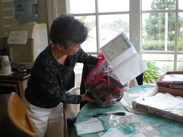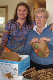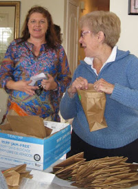 Sharon Whelan brought us boxes. Joann Bishop is preparing the bags that will hold the chances to win the Op Baskets.