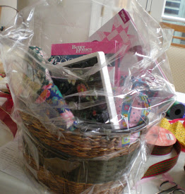 "Pink" basket containing, among other items, the pink quilt book and pink cook book donated by Rosie's Calico Cupboard. Also visible, one of the 8" t