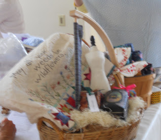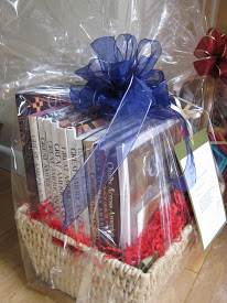 "Pink" basket containing, among other items, the pink quilt book and pink cook book donated by Rosie's Calico Cupboard. Also visible, one of the hand made 8" tiles designed with Ellen Heck designs.