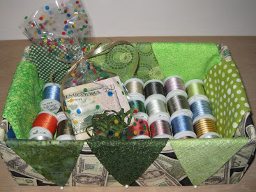 Pin Money by Threads of Friendship, created by Lyndy Dye. $150 cash, 31 6" squares of money fabric, 9 fat quarters.