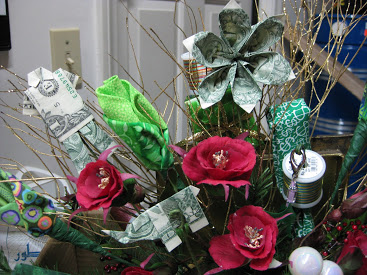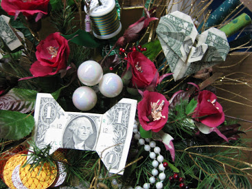 Close up of Pin Money, see the shirt and pants, elephant, and flower dollar origami.