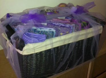 Del's Purple Basket, 15"x23"x9.5"deep, 25 lbs, huge supply of fabrics in various sizes, many notions, books and fun items. Organized by Del Thomas, donors include Holly Casey, Mary Freedman, Nancy Garparotti, Jan Hirth, Mary Leakey, Patty Mayer, Nancy Ota, Ruth Powers, Linda Rigdon.