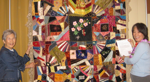 Sumi Maruyama and Hiroko Moriwaki hang labels on auction quilts.
