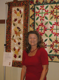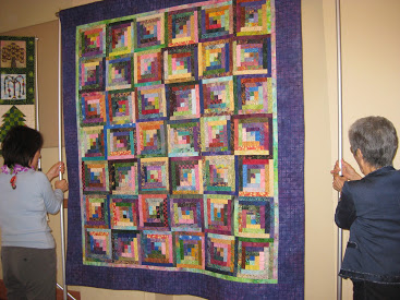 Sue Troise hangs auction quilts.
